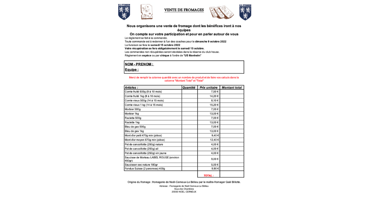 L'USI organise une vente de fromage aux profits de nos équipes de jeunes.
